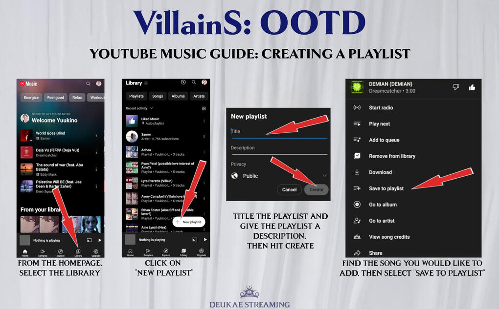 - Go to "Library" and click on "Create playlist"- Put a Name to your playlist and a description- Search for the song you want to add and click on "Save to playlist"