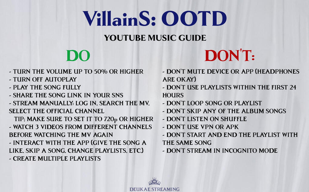 - Don't mute (you can use headphones but don't turn down the volume on your device or in the app)- Don't loop the song nor the playlist- Don't skip the focus song or any of the album songs included in the playlist- Don't listen to the playlist on shuffle- Don't use VPN or APK- Don't start and end the playlist with the same song